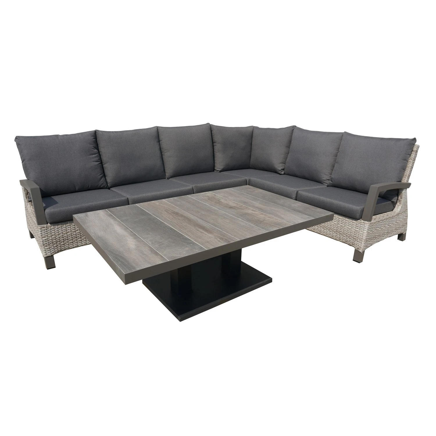 Met deze prachtige hoeklounge uit de MARSEILLE serie van Royal Seasons kun je eindeloos genieten in de tuin. Het is gemaakt van hoogwaardig wicker met een aluminium frame. Aluminium is licht in gewicht en bovendien erg sterk. Daarom wordt aluminium veel gebruikt in de productie van tuinmeubelen. De hoekbank is inclusief de MARBELLA in hoogte verstelbare tafel. Kortom – een zeer luxe hoeklounge waarmee jij maximaal geniet van jouw tuin!